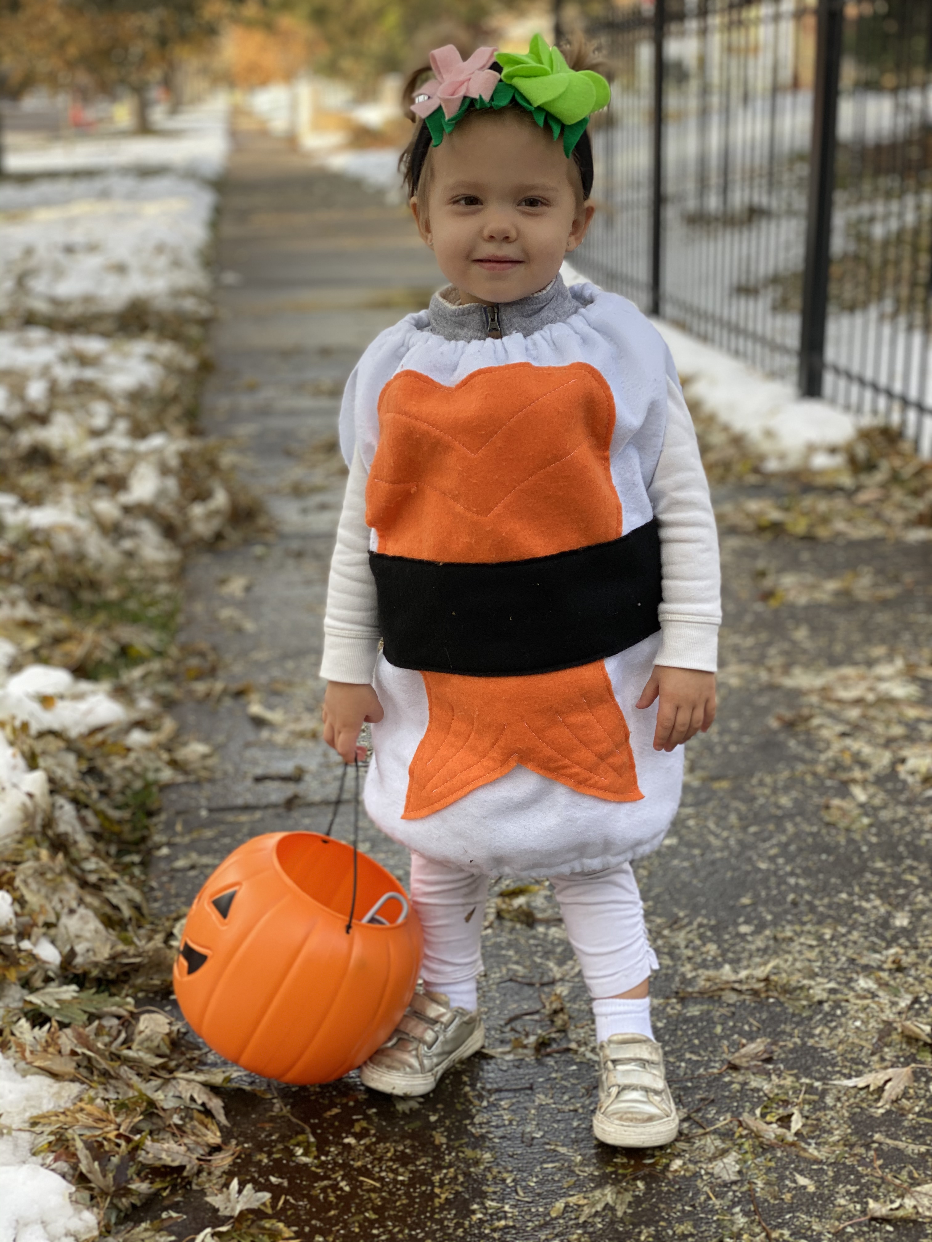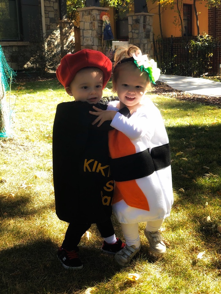 Maxwell & Riley had a fun Halloween. Riley was salmon sushi and Maxwell was Kikkoman soy sauce. Everyone loved their costumes! Riley tried chocolate for the first time and kept asking for more. In fact, she is asking for chocolate days later.